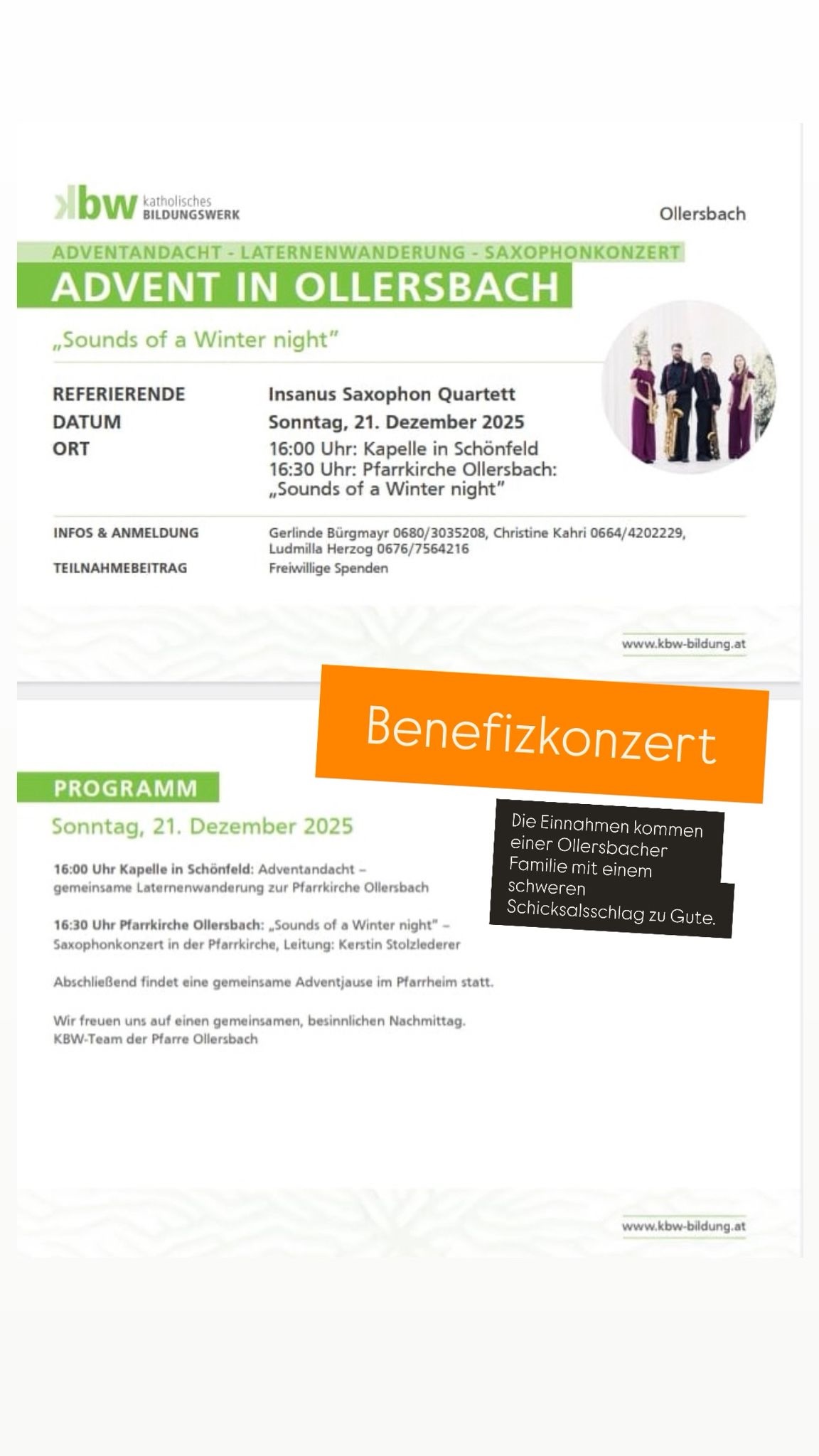 | 21.12.2025, 16:30 | Sounds of a Winter Night (Benefizkonzert) | Pfarrkirche Ollersbach | Flyer > mehr Infos > |